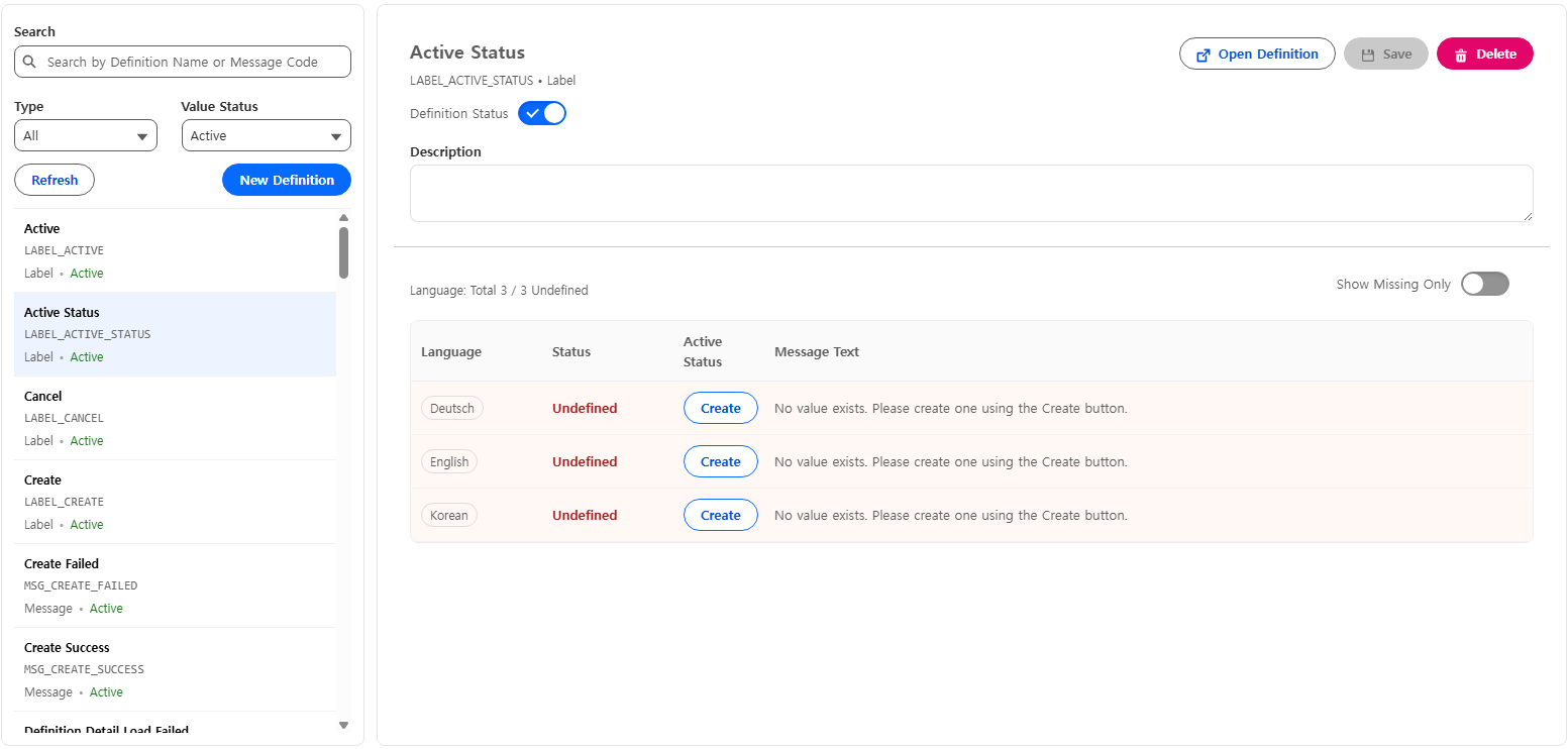 또, 사용자에게 혹시라도 UI의 문구나 번역이 마음에 들지 않는다거나, 기본 값으로 언어가 지원이 안되는 경우에 한해서 설정할 수 있도록 하기 위해서 “Overwrite”기능을 추가하였다. 기본적으로는 CMDT를 조회하되 같은 ResourceCode값으로 Definition 및 Value를 생성하면 이를 통해 기본 제공 값을 덮어씌울 수 있는 기능이다.